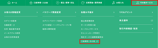 ②メニューの「その他サービス」>「各種お手続き」>「口座解約・その他」からお手続きください。