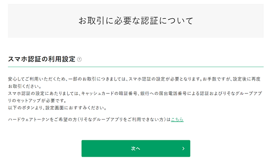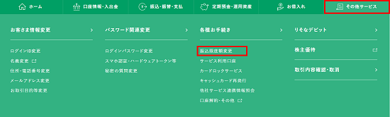 次の手順でご確認ください。 ①マイゲートへログイン ②メニューの「その他サービス」>「各種お手続き」>「振込限度額変更」から変更手続きをしてください。 ※変更手続きには秘密の質問とスマホ認証またはハードウェアトークンの認証が必要です。※スマホ認証またはハードウェアトークンが未設定の場合は以下の画面が表示されますので、ご案内に沿って設定をお願いいたします。(秘密の質問も同時に設定いただきます。)