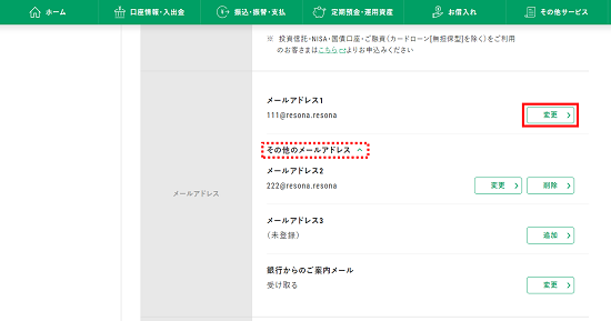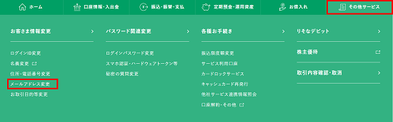 ②メニューの「その他サービス」>「お客さま情報選択」>「メールアドレス変更」を選択してください。