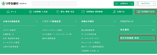 ※マイゲート画面上部の「その他サービス」より「取引内容確認・取消」を選択いただくと、過去90日分のお取引履歴を照会することができます。