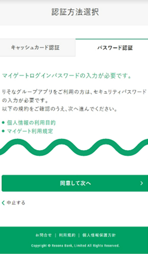 ②マイゲートログインIDをお持ちのお客さまは下部の「同意して次へ」をお選びください。マイゲートのログイン画面へ移ります。