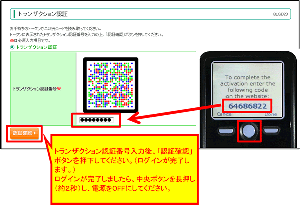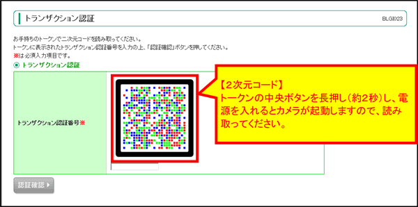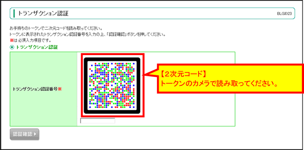 2次元コードを読み取りますと、トークンに「トランザクション認証番号(8桁)」が表示されますので、ブラウザ画面に入力し、「認証確認」ボタンを押下してください。
