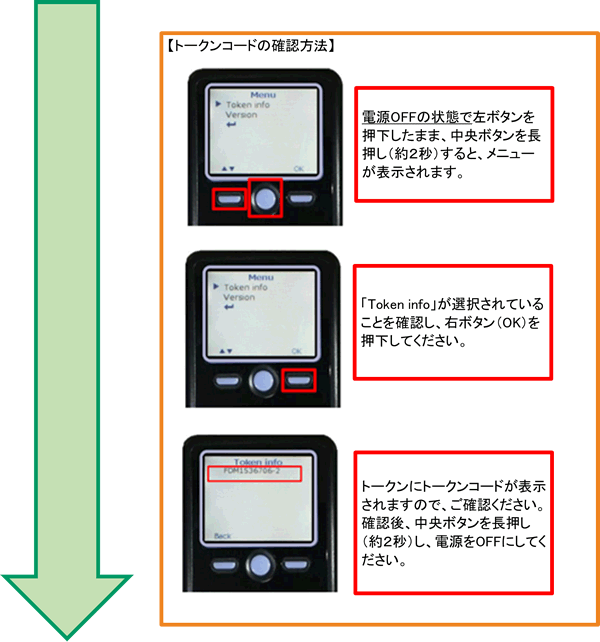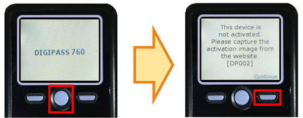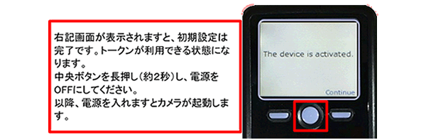 トークンの中央ボタンを長押し(約2秒)すると電源が入り、下記画面が表示されますので、右ボタン(Continue)を押下してください。