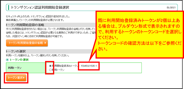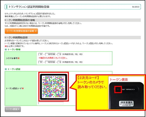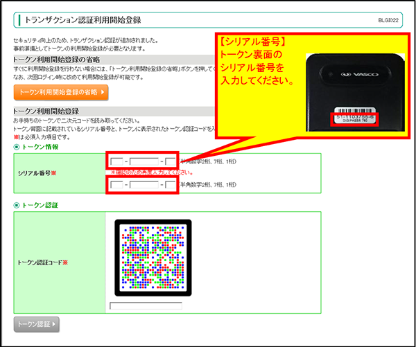 ログインしますと、トランザクション認証利用開始登録画面(BLGI022)が表示されますので、トークン裏面のシリアル番号(2桁 - 7桁 - 1桁)を入力してください。