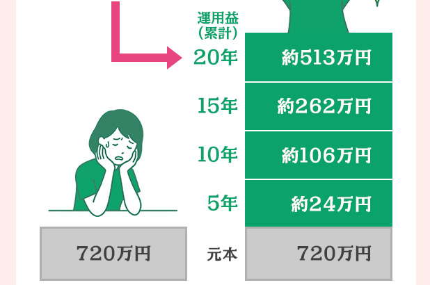 ※ 上記は毎月3万円を年率5%で運用しながら、つみたてたものと仮定したシミュレーションであり、実際のファンド等の運用実績を示すものではありません。 ※ 上記シミュレーションは複利効果のイメージを示すためのものであり、将来の投資成果を示唆・保証するものではありません。また、手数料、税金等は考慮しておりません。 ※ りそなアセットマネジメント監修によりりそなグループが作成。