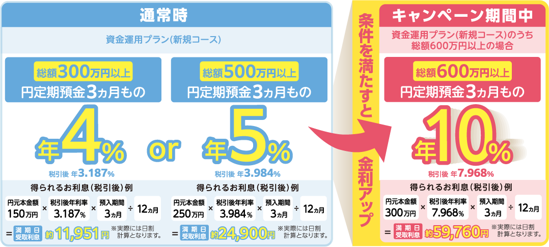- ※キャンペーン期間中、総額300万円以上600万円未満のお申込みの場合は、通常の資金運用プラン(新規コース)の金利となります。