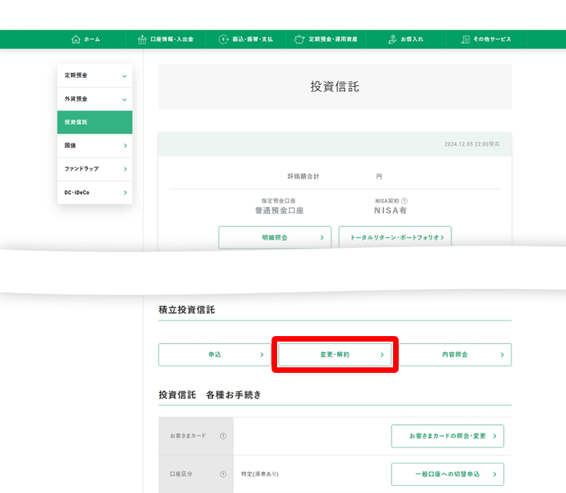 定期預金・運用資産>投資信託 より、積立投資信託の変更・解約を選択して手続きしてください。
