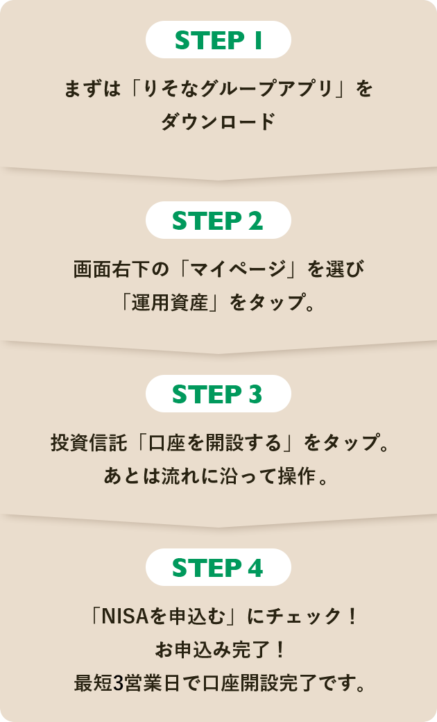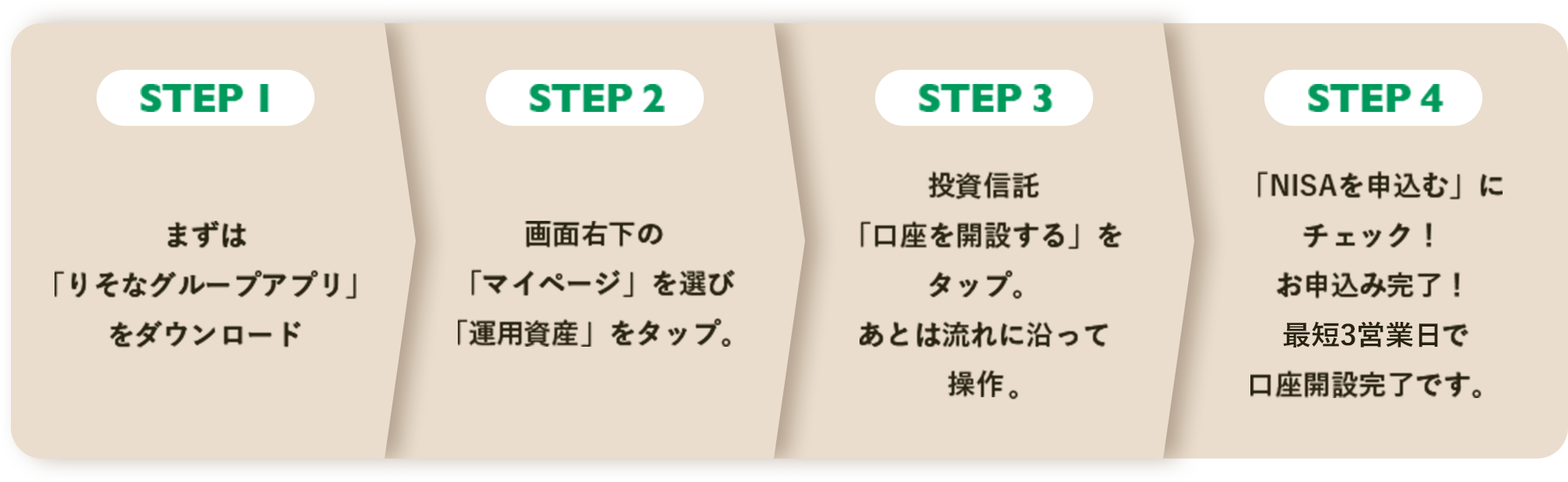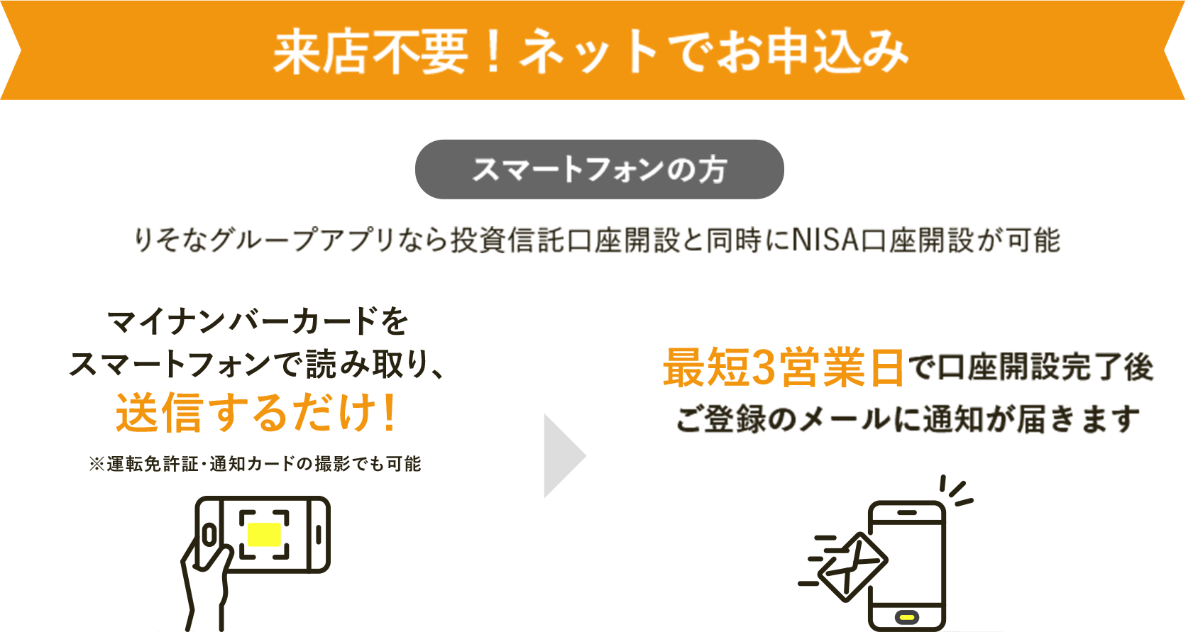 ※すでに投資信託口座をお持ちでNISA口座開設からお手続きをされたい方、過去に埼玉りそな銀行を含めNISA口座を開設したことがある方は、店頭でのお手続きとなります。