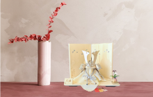 世界中の「かわいい」をあつめてぎゅっと詰め込んだお雛さまです。両袖には柔らかくしなやかな質感が特徴のチュール生地にかわいい刺繍をあしらい、透けた部分と刺繍の部分の光と影のコントラストを活かした衣装を着たキュートな女雛と両袖にブレード(刀)をあしらったシックな衣装の男雛。今時の洋間にもピッタリ合うセットに仕上げました。